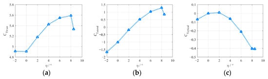 As for the average thrust of a blade, the grew when the blades were folded in the positive direction (shown in Figure 9). In addition, it diminished with the occurrence of a stall. The was approximately proportional to the fold angle. As a result, the fold angle strengthened the asymmetry of the lateral force of a blade. Fold angles above 2° led to lateral forces pointing to the windward half, and those lower than 2° led to forces pointing to the leeward half. The vertical forces kept downward for most of the fold angles, except for minor positive fold angles (2° in this case). In addition, the increased when the blades were folded in both directions.