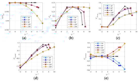 The effect of the incline angle on the overall performance of the VAWT was investigated with fold angles from −2° to 10°. The incline angle was set to 30°, 60°, 90°, 120° and 150°. Variations of the swept area of the wind turbine versus the fold angle for different incline angles are shown in Figure 10. As can be seen, variations of the swept area increased with the incline angles away from 90°, but were still quite tiny for the range of fold angles observed. The sensitivity of the to the fold angle diminished with the incline angles away from 90°. A similar effect could be found for the and . However, the effect on the was more complicated, which was the comprehensive result of both the variable modulus of aerodynamic forces resulting from the pitch angle and different decompositions of forces resulting from different orientations of the blades. For incline angles from 90° to 60°, vertical forces grew downward for most of the fold angles. Then, for incline angles from 60° to 30°, the vertical forces increased downward for the negative fold angles, but the vertical forces trended upward for the positive fold angles. The opposite changes were observed with . The upward vertical forces could diminish the burden of the gravity of the blades on the supporting structures of the wind turbine.