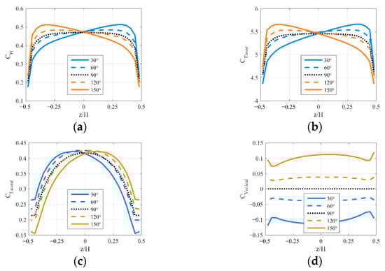 Average aerodynamic forces along the blade span with different incline angles: (a) , (b) , (c) and (d) .