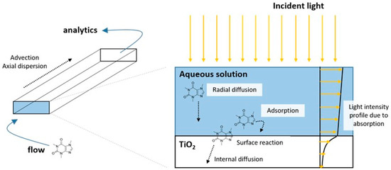 The internal surface of the microchannel is usually covered with a thin layer of photocatalytic material. The light is often irradiated on the opposite side, where no catalyst is present. In this case, the main factors controlling the degradation are (i) adsorption of species on the catalytic surface and surface reaction; (ii) advection and diffusion of the species in the liquid phase; (iii) diffusion of the species in the solid catalyst for porous materials; (iv) light absorption of the liquid solution, containing the pollutants and degradation products; (v) light absorption of the solid catalytic layer, resulting in the generation of photoexcited electron/hole pairs and oxidizing species.