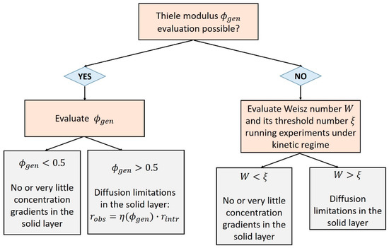 where is the volume of the porous layer, is the exposed surface, is the intrinsic kinetic constant, and is the effective diffusion coefficient. is also known as the Weisz modulus, when is replaced by the observed reaction rate. In this case, it has also been used for assessing pore diffusion limitations for Langmuir–Hinshelwood rate laws [24]. High values of the Thiele (or Weisz) modulus indicate that the reaction is relatively fast compared to internal diffusion, and as a result, the reagent cannot penetrate in the catalytic layer. On the contrary, low values indicate the absence of internal diffusion limitations. Definition of the Weisz modulus enables faster determinations, since it is based on the evaluation of the observed reaction rate, whereas the Thiele modulus is dependent on the intrinsic kinetic constants, not known a priori. However, the limiting values for the Weisz modulus to distinguish between the different regimes are dependent on the product for Langmuir–Hinshelwood kinetics, which cannot be always easily determined in the presence of external mass transfer limitations. In this case, tailored experiments in the absence of external mass transfer limitations can be run for its evaluation. Even when this is not feasible, estimation of the order of magnitude is often possible. A general procedure to guide the model choice for the solid layer is reported in Scheme 2 and Scheme 3.