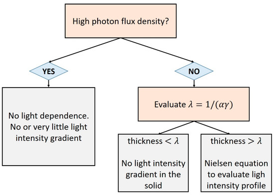 where is the thickness of the catalytic layer and is the first-order kinetic constant. For more complex kinetic laws, Equation (14) must be solved numerically and there is no general functional correlation for any value of the parameters. To take into account the dependence of the kinetic constant on the light intensity and, therefore, the photon flux density in the solid layer, the Nielsen equation was used, based on semiconductor physics:
