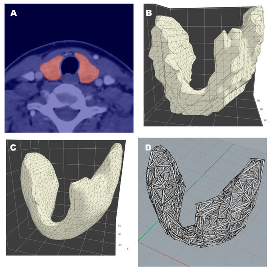 Thyroidal prototype of mesh-work 3D modeling: (A) Segmentation of thyroid gland in tomographic image; (B) reconstruction via triangular mesh; (C) surface smoothing; (D) resultant 3D model.