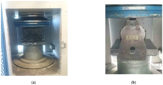The casting and curing of concrete were done according to ASTM C192/C192M-16a. The fresh concrete was placed in three layers in the mods. Cube sizes of 100 × 100 × 100 mm were used for the compressive strength test, 100 × 200 mm size cylinders were cast for split tensile and elastic modulus, and 100 × 100 × 500 mm prisms were used for the flexural strength test. After mixing each of the concrete mixes in a pan type mixer, its slump was measured according to ASTM C143/C143M-15a before casting into its respective mold. After casting all specimens, they were left in the molds overnight and covered by a black plastic sheet. Overnight and after demolding, all samples were moved to the curing room (at 100% Relative Humidity) until the time of testing. Concrete cubes for compressive strength were tested according to BS EN 12390-3:2009 at 3, 28, and 56 days. The cubes were tested in a 100 kN capacity digital testing machine, as shown in Figure 1a. Concrete prisms were tested for the four-point bending test using a 1000 kN capacity actuator attached to the loading frame, as shown in Figure 2. The purpose was to determine the toughness index and the load-deflection curve. The bending test was conducted at 28 days, according to ASTM C 1018-97. The third test in this study was a split-cylinder tensile test (STT), which was conducted on the same machine used for compressive strength; the test set-up is shown in Figure 1b. STT was done to obtain tensile strength and elastic modulus of the concrete. Elastic modulus was determined using a stress-strain curve acquired during the beam bending test. A 60 mm long strain gauge was pasted to the sample to measure strain values and was connected to a data logger, conforming to ASTM C469/C469M. Even though the split-cylinder test was done according to ASTM C496/C496M-04, this test was also done at 28 days.
