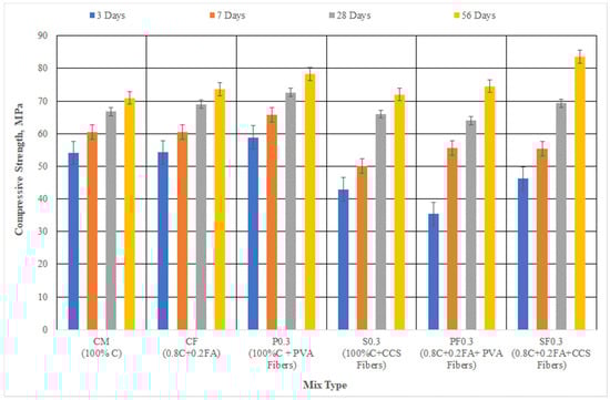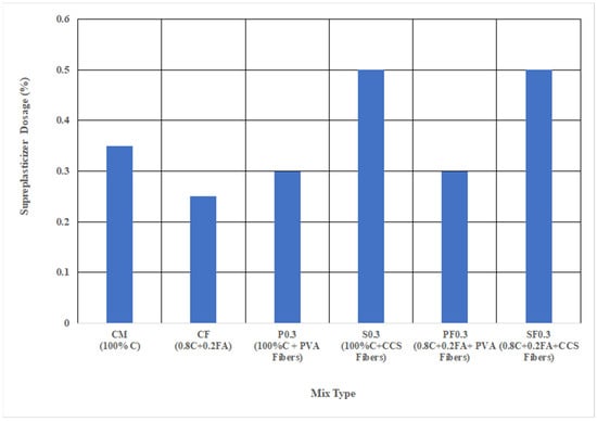 As described in the literature, the addition of fibers to concrete reduces its workability [,]. It is a general practice for achieving a concrete’s required workability; an appropriate superplasticizer dose is added. The same approach was followed in this study to acquire the desired workability of the concrete. Figure 4 shows the amount of superplasticizer added to obtain a targeted slump value between 90–110 mm. The water to cementitious material ratio was kept constant at 0.4. It is well established [] that the addition of fly ash increases the workability of concrete. Therefore, the control mix containing fly ash (CF) included a lower dosage of superplasticizer (0.25%) than that added to the 100% cement mix (CM), which was 0.35% for obtaining the targeted slump of concrete. However, the fly ash concrete containing fibers required a higher dose of superplasticizer (SP) for achieving the targeted value of slump. For concrete mixes containing 0.3% volume fraction of PVA, a dosage of 0.3% SP was added. With the same volumetric fraction of CSS fibers, the dosage of SP was increased to 0.5%. In all such cases, the addition of SP dosage did reduce the compressive strength value. The compressive strength results are discussed in the next section. The analysis of the fibers’ effects on concrete workability showed that CCS fibers caused a substantial reduction in concrete workability than did the PVA fibers. CCS fibers required 0.5% content of SP dose, whereas PVA fibers needed only 0.35% for achieving the desired slump of 90–110 mm.