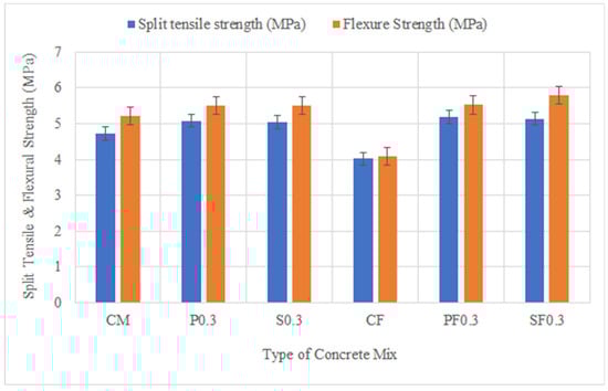 Split Tensile and Flexural strength of different concrete mixes measured at 28 days.