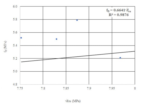 The literature has indicated that the flexural strength of fiber reinforced concrete is usually related to the ultimate compressive strength of the concrete; fcu as  [,]. Figure 8 shows the correlation between the flexural strength and the ultimate compressive strength, and the following correlation was obtained: