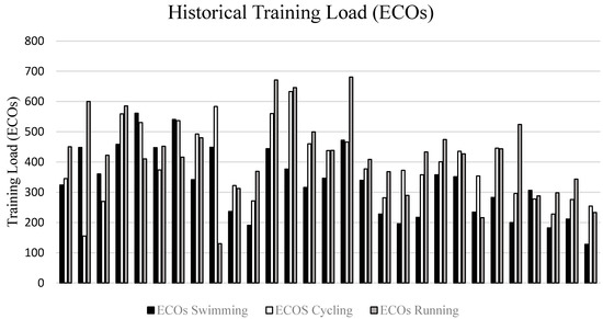 Historical objective load scale (ECOs) training load in the disciplines of swimming, cycling and running performed by the triathletes during the season.