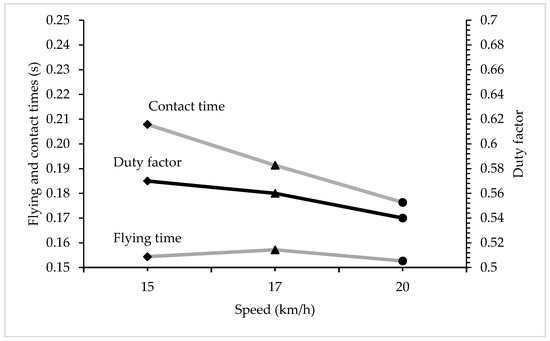 The same procedure was used to determine the biomechanical parameters linked to the MAS and ventilatory thresholds. The following spatial variables were analyzed through the Stryd “Power Center” on the Stryd application: stiffness, measured in kilonewtons per meter (kn/m); contact time (CT), measured in milliseconds (ms); vertical oscillation (VO), measured in centimetres (cm); and cadence, measured in steps per minute (spm). The values of the spatiotemporal parameters were averaged over the steps of the same test speed, for at least 30 s. From the recorded contact and flight times was obtained the variable “duty factor”, which is the quotient between the contact time and the total step time [18]. In the same way as in previous investigations, to compare subjects of a different stature, the step amplitude was normalized, dividing it by the height of the trochanter [18].