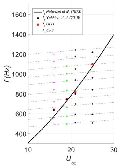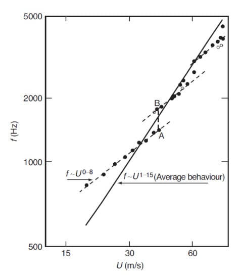 Figure 7 illustrates results of the far-field sound measurements obtained in [] and presented in the form of a color-level map, with the frequency and flow speed as coordinates in logarithmic scales. The results are plotted for NACA-0012 airfoil at AOA = 0°, and for SD7003 airfoil at AOA = 2° (which geometrical AOA corresponds to the zero effective AOA). The dominant tones at each measured flow speed are marked by red symbols. Clearly, these results feature the ladder-type structure discussed by previous investigators [,,,,] with the dual dependence attributed to shedding and AFL mechanisms to be further addressed below.