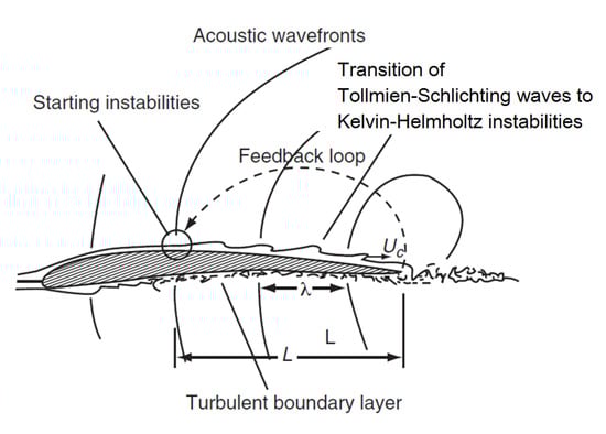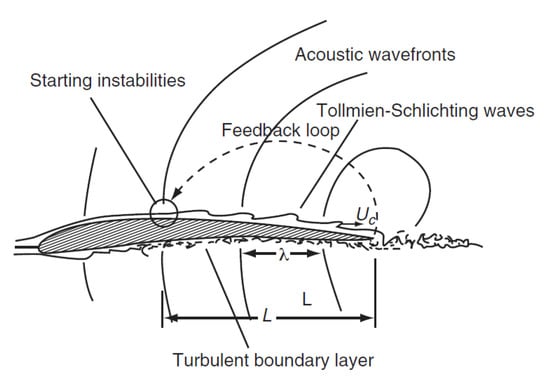 Tam’s [] AFL scenario was later re-visited by Longhouse [] who suggested a different perspective on the feedback-loop mechanism based on the hypothesis of Fink [] and Schlinker and Amiet []. Instead of considering the AFL to occur in the wake, Longhouse [] hypothesized that the process actually began very early on the airfoil surface. As illustrated in Figure 2, the proposed AFL appears as a result of instabilities incepted near the airfoil’s leading-edge (LE) in the form of T-S waves. Due to the natural flow convection, the T-S waves were presumed to have sufficient time to amplify in strength as they approached the TE where they scattered into noise. This scattering mechanism, in addition to the airfoil natural vortex shedding, generated the acoustic waves propagating upstream to induce the BL vortical disturbances through the receptivity mechanism. In the established AFL process, the phase of the upstream-propagating acoustic wave must match the phase of the downstream-traveling instability waves so that a stronger acoustic wavefront could be deployed upstream to maintain the feedback loop.