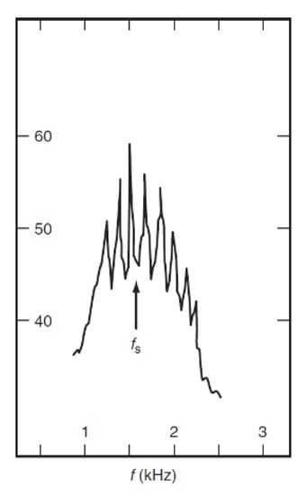 where the tonal frequency fn is related to the modal number n, distance L between the instability wave inception point (typically, the point of maximum velocity on the surface), the wave convection speed Uc, and the speed of sound c0. However, while Equation (11) may help interpret the frequency spacing in the observed cluster of peaks, it does not explain the actual selection of frequencies in the spectrum.