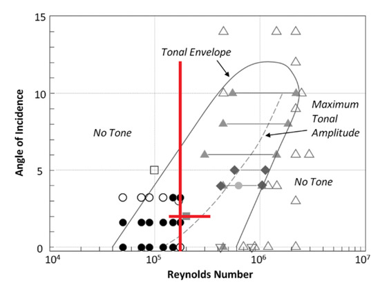 - Pröbsting, S.; Scarano, F.; Morris, S. Regimes of tonal noise on an airfoil at moderate Reynolds number. J. Fluid Mech. 2015, 780, 407–438. [Google Scholar] [CrossRef]