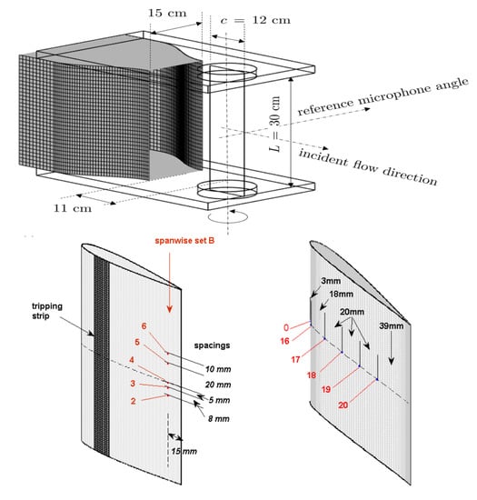 Perhaps the most comprehensive and careful (from the standpoint of isolating facility interference effects) experimental measurements of the decade were carried out in an anechoic low-speed wind tunnel facility at Ecole Centrale de Lyon (ECL), with the exhaustive details of the experimental campaign described in Yakhina et al. [] and briefly reviewed below as an example of the advanced experimental approaches. The tonal signature of the low-speed NACA-0012 and SD-7003 airfoils was examined for a range of transitional flow regimes characterized by variable inflow velocity (5…40 m/s, corresponding to Re = 0.4 × 105…3.2 × 105), AoA (−15°…15°), and unsteady inflow conditions to allow for thorough mapping of the regions of tonal production including effects of upstream unsteadiness. The issues raised by Nash et al. [] related to possible installation effects producing latter-type tonal structure motivated a new design of the mounting device compared to the first stage of the experimental campaign described in []. The employed configuration minimizes spurious reflections from end-plate surfaces used in most experimental setups described in the literature and ensures that upstream-propagating sound from the TE is the only mechanism of acoustic excitation for instabilities. The new design was tested and confirmed that larger end plates produced no impact on the results. The ladder-type structure of the acoustic signature was thus believed intrinsic to the development and radiation of instability waves in the transitional flow. The only possible remaining installation effect is the jet-flow deflection due to lateral momentum injection associated with the mean lift as the airfoil is set at a non-zero AoA. However, this was not believed to significantly modify the underlying physics of the observed phenomena. Far-field acoustic measurements performed in the mid-span plane using a single microphone on a rotating arm provide an overview of frequency-angle characterization and spectral directivity of the sound. To correlate acoustics with wall-pressure fluctuations, an elaborate technique of measurements using remote-microphone probes (RMPs) flush mounted along the airfoil surface was employed (see Figure 6).