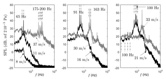 Sound-pressure spectra extracted from the map in Figure 7b showing multiple tones for SD7003 airfoil at various flow speeds (presented in three plots for clarity). Values of the averaged frequency jumps for series of tones indicated on the plots (dashed vertical segments) [].