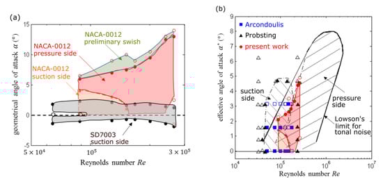 (a) Geometrical angle-of-attack (AOA) vs. Re tonal noise map from [] for NACA-0012 and SD7003 airfoils. Filled circles show the limits of the tonal-noise regime; empty circles point to the onset of low-amplitude noise. Green area is the primary emission for the NACA-0012 airfoil, red and orange areas are tonal noise generated by pressure or suction sides of the NACA-0012, respectively, and grey area is tonal noise generated by suction side of SD7003 airfoil. (b) Effective AOA vs. Re tonal noise map from [] for NACA-0012 airfoil, compared with previous investigations (see also Figure 4).