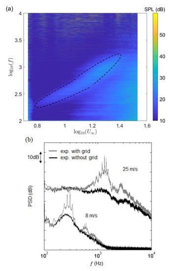 (a) Frequency-flow speed chart for NACA-0012 airfoil at zero AOA with small-scale turbulence; (b) compared far-field sound spectra of the clean flow (grey) and with upstream turbulence (black). Flow speeds 8 m/s and 25 m/s. Both pairs of spectra are shifted by 20 dB from each other [].