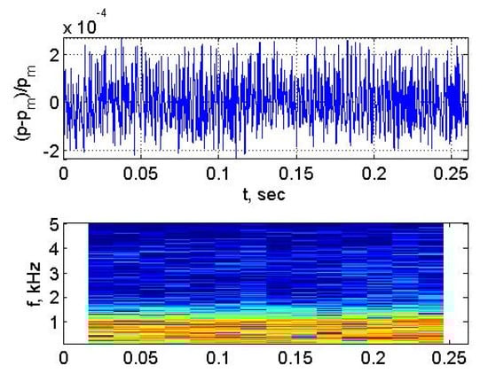 The top spectral peaks in Figure 11 manifest the presence of AFL, with multiple tones corresponding to the selected frequencies of the amplified and scattered instability waves. They are present in both analyses but appear sensitive both to the simulation time step and the frequency resolution. Note that high sensitivity of the unsteady data may be indicative of unaccounted, inherently 3D processes taking place in the transitional flow regimes. In a related sense, it also points to the highly nonlinear character of the physical processes involved in the flow-acoustic interactions. In experiments, the intermittency of the radiated tones induced by the TE scattered vortical structures is often witnessed and usually revealed using the spectrogram method wherein the total period of the signal is divided into a number of overlapping bands with the spectral analysis applied to each band. Figure 12 (bottom plot) illustrates the result of the method applied to the pressure signal extracted from the near-field simulations [] (that produced the sound spectrum in Figure 11) using 15 bands with 50% overlap. The amplitudes of the present tones vary by color from deep blue to dark red. They appear to fluctuate with time although the main tonal frequency content remains unchanged. Desquesnes et al. [] also realized the presence of the random component in the computed signal but proved the consistency of the primary tonal spectrum using the related periodogram method based on averaging the results of the Fourier transform applied to each time band.
