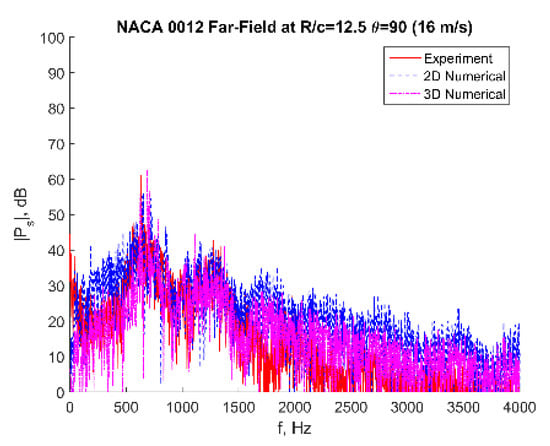 Comparison of 2D (blue) vs. 3D (magenta) vs. measured (red) far-field pressure spectra [].
