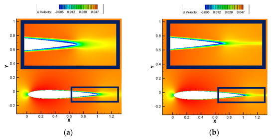 Time-averaged U-velocity contours in 2D (a) and 3D ILES (b). Baseline case for NACA-0012 at 0° AoA and U = 16 m/s [].