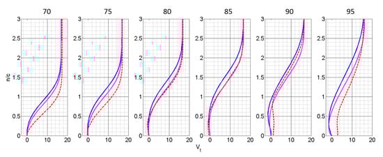 The comparison between 2D and 3D ILES results [] is further elaborated in Figure 14 showing predicted time-averaged U-velocity contours. Overall, the latter are identical from LE to mid-chord due to the absence of separation and inherently laminar flow. As the flow convects past the mid-chord and travel towards the TE, the differences between the 2D and 3D results become more noticeable as the separation regions and wake structures appear larger from 2D simulations. Figure 15 further illustrates the differences by showing the predicted BL velocity profiles in comparison with experimental measurements [,], for selected probe locations.