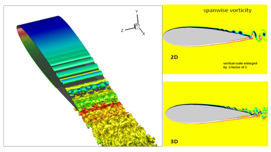 Time snapshots of BL vorticity dynamics from 2D and 3D ILES simulations. NACA-0012 at 2° AoA, U = 25 m/s. (Adapted from []).