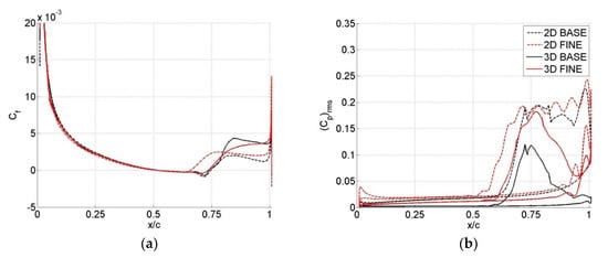 For the same case study, Figure 17 further illustrates the comparison in [] by also examining grid sensitivity of numerical 2D vs. 3D predictions for two critical parameters: variation of skin friction coefficient cf indicating suction-side LSB position in terms of BL separation point, and variation of suction-side RMS pressure coefficient (cp)RMS revealing dynamics of instability structures through and after LSB zone. In the fine-mesh (1285 × 789) 2D calculations, the separated regions form between x = 0.5 c and x = 0.75 c starting with a very thin separated layer and followed by a near-reattachment point at x = 0.67, with a rather short LSB. The results deviate from predictions using the 2D base (643 × 395) and both 3D meshes, all predicting delayed reattachments with slightly longer LSB zones. Correspondingly, Figure 17b shows that the 2D fine-mesh results predict the rise in RMS pressure slightly further upstream compared to all other computations. The RMS pressure distributions obtained from 2D simulations correspond well with one another and sustain the levels nearly to the trailing edge. This agrees well with other numerical predictions based on 2D analysis [,,,], and is identified by the process of slow viscous T-S instability growth before reaching the separation point, followed by transformation of T-S instabilities into inviscid, fast-growing K-H instabilities sustained by LSB’s separated sheared layer, and finally their nonlinear saturation through LSB and realization in the form of large-scale vortical rollers (Figure 16). From 2D analysis, such rollers sustain themselves nearly unchanged to the point of TE scattering into acoustic waves. In contrast, 3D results (more grid-sensitive) indicate a rapid decrease of RMS pressure amplitudes after reaching the peak levels, which is again related to the spanwise energy redistribution following the point of turbulent reattachment.
