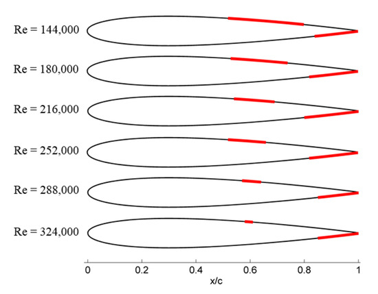 In view of the relationships [,], the connection of the above discussed RMS perturbation dynamics with the modal stability analysis is apparent, and further elaborated in the majority of the reviewed studies, albeit primarily from the standpoint of the AFL frequency selection mechanism (discussed in the next section). In [], the LSA analysis from Section 3.2.4 was applied in conjunction with parametric numerical analysis of NACA-0012 airfoil to investigate transition from tone-producing to no-tone-producing regimes in AOA-Re plane (see Figure 4). By correlating different flow regimes with position and size of LSB on either side of the airfoil, it was determined that at low AoA, distinct tones were present and dominated the acoustics of the airfoil. However, the tones would disappear at higher AoA due to the LSB migration towards the LE and allowing sufficient time for the flow to transition to fully turbulent regime, thus suppressing the AFL mechanism. On the other hand, for a fixed AoA, the increase in flow velocity (Re) was associated with LSB shrinking on the suction side and an increasing dominant contribution of the amplified instabilities on the pressure side (Figure 18) driving the tonal noise production mechanism, which agrees with experimental findings of Yakhina et al. [] and Pröbsting et al. []. The results of LSA analysis [] correlated with numerical predictions of separated regions for Re = 144,000 and for Re = 288,000 are illustrated in Figure 19.