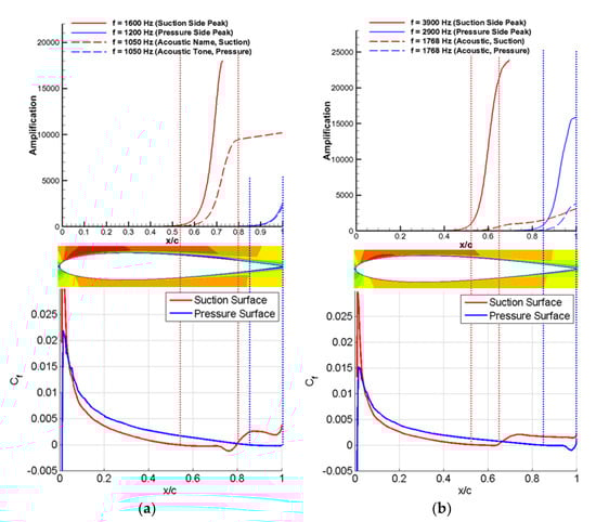 Linear stability analysis (LSA) results (correlated with numerical predictions of laminar separation bubble (LSB) zones) showing instability chordwise amplification on suction and pressure sides for Re = 144,000 (a) and Re = 288,000 (b) [].