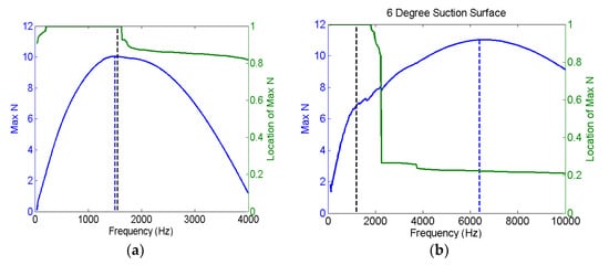 Instability mode amplifications (blue line), location of modal peaks (green line), peak acoustic frequency (dashed black line) for AOA of 0° (a) and 6° (suction side) (b) [].