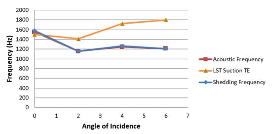 In their parametric study of NACA-0012 airfoil at Re = 180,000, Nguyen et al. [] also considered frequency variation with AOA of the most amplified instability mode and the peak radiated acoustic tone. Figure 20 compares the LSA-predicted frequencies corresponding to the instability waves with maximum amplification (dashed blue lines) against the peak frequencies of calculated acoustic spectra (dashed black lines). In addition, the airfoil surface location where each frequency mode reaches its maximum is shown by the solid green line. Note that for AOA of 0°, the predicted frequency of the most amplified instability mode agrees well with the observed far-field frequency. For other cases, however, a substantial difference was seen, and was also observed between the predicted peak amplifications for the suction and pressure surfaces. Overall, as the angle of incidence increases, the disparity between the peak LSA-predicted and acoustic tonal frequencies appears to grow. This is illustrated in Figure 21 also showing that the vortex shedding frequency agreed well with the observed acoustic peak tone. Such results are in agreement with those in [], and it is reasonable to echo some of the scenarios proposed in [] including the hypothesis of resonant interaction between AFL and shedding mechanisms leading to tonal response with greatly amplified amplitude, compared to the weak pure shedding tone in DNS study of Tam and Ju []. It also seems plausible that from the multitude of LSA-identified amplified instability modes, the AFL mechanism described by Equation (11) selects and elevates only those modes in the observed acoustic spectrum that appear the closest to the shedding frequency. We recall that Tam and Ju [] identified the shedding frequency with that of the most amplified near-wake K-H instability in the free shear layer. The TE scattering of such near-wake instability was claimed as the source of the shedding tone in the absence of AFL. As hypothesized in [], such wake instability mechanism may superimpose on the AFL mechanism in airfoil tonal noise production, both related to TE scattering of saturated shear-layer vortical structures. To summarize, when the airfoil flow is fully laminar with no AFL present, the remaining shedding tone appears very weak, as demonstrated by Tam and Ju []. We have also seen that when the AFL mechanism is suppressed (due to BL tripping or a low-intensity upstream turbulence), the acoustic spectrum still reveals a broadband hump centered around the shedding frequency [,]. With the AFL present, the shedding process still provides with the natural selection of the spectral region amplified due to the mutual resonant interference of both mechanisms leading to the observed multi-tonal response.