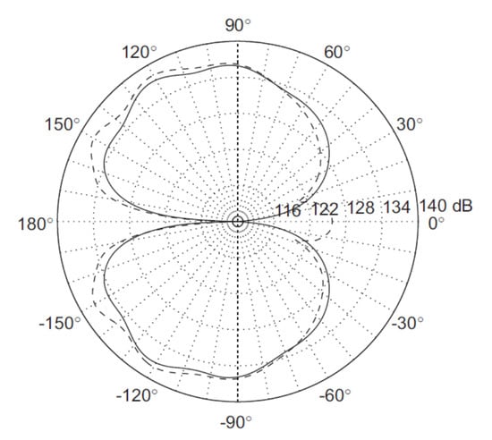 Comparison of acoustic feedback loop (AFL) acoustic directivity obtained from direct numerical simulations (DNS) (dashed line) and predicted using Amiet’s trailing edge (TE) noise theory (solid line). (Reprinted from [], with permission from Elsevier).