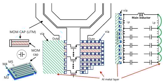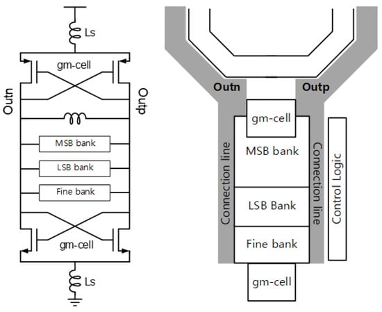 where Foffset is the offset frequency of the oscillation frequency and gL is a loss of the inductor. To reduce the phase noise and power consumption, gL should reduce the loss of the inductor, as shown in Equation (2). The inductor in the LC tank, which affects the phase noise and output signal power, was designed with various types of inductor for high-Q design [,]. A high-Q inductor using the embedded wafer level ball grid array (eWLB) package inductor was implemented due to its excellent phase noise and higher voltage swing, but its power consumption was large []. Conversely, the 3D helical inductor was smaller and low-power, but did not have excellent phase noise with a low Q-value []. The design of the inductor was critical, but the layout with a small coupling capacitor and a small metal resistance increased the area of the inductor because it was designed with a wide metal layer and little mutual coupling between metals. However, chips in low-cost applications have limitations on chip size, making it impossible to use a relatively large inductor. Therefore, an optimal-sized inductor must be designed that includes appropriate losses, and a large gm cell structure must be selected that can compensate for the losses. Here, the capacitor in the LC tank had a high Q and could be neglected.