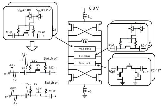 Figure 4 shows a simplified schematic with three capacitor banks, i.e., the MSB, LSB, and fine bank. All capacitor banks were designed with unit-weighted instead of binary-weighted structures to ensure linearity in the frequency step. Even though the area of the unit-weighted capacitor bank is slightly larger than that of the binary capacitor bank, it presents many merits in terms of linearity and flexibility in design []. For example, to change the capacitor required for linear oscillation frequency control, all unit capacitor sizes in the capacitor bank were changed, maintaining constant the ratios of capacitor sizes, such as unit ×1, ×2, ×4, and ×8 []. However, in the unit-weighted structure, the optimum capacitor unit value considering the parasitic components generated in the layout can be individually applied to optimize performance. For linearity and reliability, the unit capacitor contains inverter logic to bias the source and gate of the switch. Assuming a voltage swing (Vpp) of 0.8 at the output node and a supply voltage for the inverter logic of 1.2 V, when the switch was turned off, the turn-off-resistance of the switch was a few mega ohms, and the Vgs of the switch produced a voltage swing from −1.6 to −0.8 V based on the 1.2 V supply. Ensuring the Vgs reliability of a low-voltage threshold (LVT) switch with low turn-on resistance is difficult, therefore, a thick-oxide metal-oxide semiconductor FET (MOSFET) switch was used for the large signal swing of the DCO. However, the thick-oxide MOSFET switch increases the turn-on resistance and layout area, which complicates the design of the capacitor bank. To solve the reliability problem [], if it is possible to supply a voltage lower than 1.2 V on the source voltage, an LVT switch with a low turn-on-resistance can be used. For this purpose, the supply voltage of the source inverter was 0.8 V, the same as the voltage of the DCO, and a different supply voltage from the inverter voltage for the gate was applied, as shown in Figure 4. This helped to improve the linearity and reliability of the DCO through a simple configuration power separation scheme. To reduce the mismatch between unit capacitors, the unit capacitor and control circuit should be arranged separately in the layout. This separation makes the arrangement conditions of all unit capacitors the same.