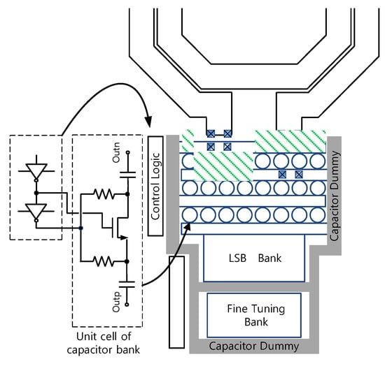 Figure 5 depicts a useful method for reducing the mismatches between unit capacitors. In this design, the electrical control part and the unit capacitor cells were separated. The circles in Figure 5 represent a unit capacitor cell, which consisted of a switch, two capacitors, and two DC-blocking resistors. All these unit cells were located inside the capacitor dummy guard. The dummy was composed of unit cells that were the same size as those used for oscillation frequency tuning. This capacitor dummy layout was a layout technique for making all the coupling effects generated by the metal layer the same. In addition, the control logic blocks were located as far as possible outside the dummy for separation. When the electrically isolating layout was adopted, the randomness of the oscillation frequency was reduced, as shown in earlier studies of fabricated DCOs []. This layout method was applied to all capacitor banks, such as the MSB, LSB, and fine frequency tuning banks.