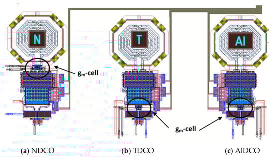 To verify the effect of the proposed layout methods, three DCOs were implemented in then 55 nm CMOS process, as shown in Figure 6, and measured by a digitally controlled, embedded system. The DCOs were designed with the same inductor, capacitor banks, gm cell, and output buffers. The NDCO on the left of Figure 6 had a gm cell in the neck of inductor and the TDCO in the middle had a gm-cell in the tail of the capacitor bank. The Al-metal DCO (AlDCO) on the right of Figure 6 had a gm cell in the tail of the capacitor bank, which was applied to the Al metal layer for high linear frequency tuning.