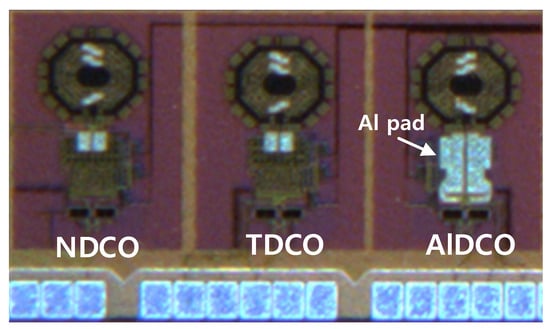 Figure 7 shows a chip picture of the designed DCOs. The NDCO and TDCO were designed with a layout area of 0.072 μm2 and the AlDCO with a layout area of 0.06 μm2, all integrated into one chip for comparison. For accurate performance comparison, the main inductor, capacitor bank, and gm cell in the DCO were used identically.