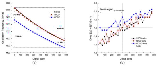 Figure 8 shows the oscillation frequency range and the change in frequency according to the digital code. As shown in Figure 8a, the difference of measured maximum oscillation frequency was only 23 MHz between NDCO and TDCO. However, AlDCO presented a 347 MHz difference in maximum oscillation frequency compared to NDCO. The oscillation frequency range of NDCO and TDCO was about 923 MHz, and AlDCO was measured as having an oscillation frequency range of 775 MHz. Figure 8b shows the slope of the frequency according to the digital code. AlDCO showed a relatively linear frequency change compared to NDCO and TDCO, as expected, due to the additional Al layer. However, the maximum oscillation frequency was 148 MHz lower than that of other DCOs. In general, capacitor banks have small capacitor values at low digital codes. It becomes difficult to attain linear frequency control given the parasitic inductance of the layout. As shown in Figure 8b, the AlDCO produced a linear result at a relatively low digital code compared to the other DCO layouts. The results showed that the additional Al metal layer produced a linear frequency change effect but had a lower maximum frequency due to the parasitic capacitor generated between the capacitor banks. As such, when designing a DCO using an Al metal layer, a sufficient frequency margin should be considered.