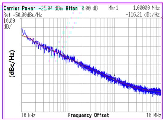 Figure 9 shows the phase noise of the designed NDCO at 4.8 GHz. The DCO exhibited low phase noise of −116.1 dBc/Hz at 1 MHz with a 0.8 V supply voltage. The overall performance of the DCOs can represented by a figure-of-merit (FoM) as follows []: