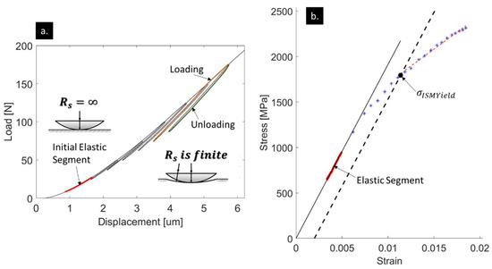As mentioned earlier, each unloading segment (indicated in Figure 3a) was analyzed to produce one datapoint on the indentation stress-strain curve. Only a small number of unloading segments are shown in Figure 3a for clarity. In the results presented in this work, ~20–25 unloading segments were utilized in the extraction of each indentation stress-strain curve. The elastic loading and all of the unloading segments were subsequently analyzed using Hertz’s theory for frictionless elastic contact between two quadratic surfaces. Pathak et al. [14] demonstrated and validated this method by testing both aluminum and tungsten samples and directly comparing the results to those obtained using a continuous stiffness measurement. The following relationships are utilized: