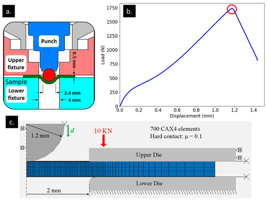 (a) A schematic of the SPT experimental setup. (b) A typical measured SPT load-displacement curve. (c) Finite element (FE) mesh used for SPT simulations.