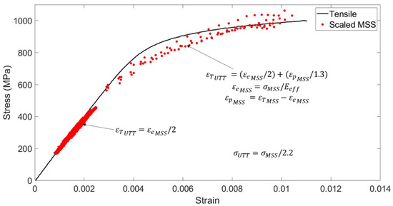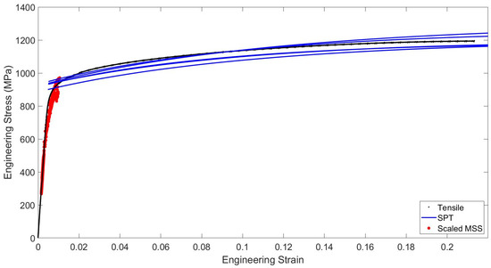 The MSS and SPT stress-strain curves were combined graphically after the MSS curves were scaled (see Equations (10)–(13)) and both MSS and SPT stress-strain curves were converted from true stress-strain curves to engineering stress-strain curves for comparison with UTT measurements. The scaled MSS data is shown in greater detail in Figure 5.