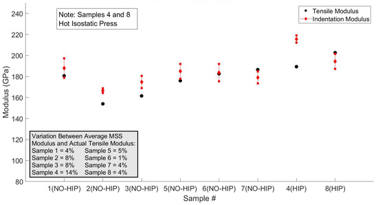 Khosravani et al. [18] have demonstrated that the values of Young’s moduli of the samples can be estimated using Equation (3) and the MSS measurements of obtained from the initial elastic portions of the indentation stress-strain curves. These estimated values for the Inconel 718 samples in this study are compared against their corresponding direct measurements from UTT in Figure 6.
