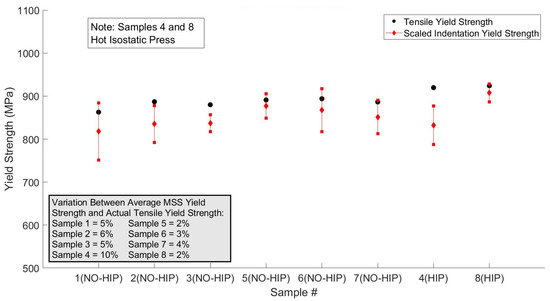 The 0.2% offset UTT yield strength can be estimated from the 0.2% offset MSS yield strength by dividing it by a scaling factor of 2.0 as Patel and Kalidindi [17] demonstrated and validated in their FE simulation studies. Figure 7 shows a comparison of the average and standard deviation of the tensile yield strength values extracted from MSS measurements for all samples tested in this work against the yield strength values measured directly from the UTT.