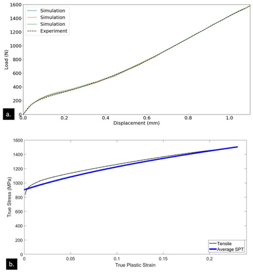 A few different corrections to the measured load-displacement curves were necessary before applying SPT analyses protocols described in Section 3.2. A zero-point correction in the form of the subtraction of a constant value was needed for the measured displacement. This constant value is established by fitting the very early elastic portion of the SPT load-displacement curve to a linear model and examining where it intersects the x-axis of the plot. This correction ensures that the initial portion of the measured load-displacement curve goes through the (0,0) point. Leclerc et al. [33] determined that a second correction is needed to account for the machine compliance and other similar effects. This correction function (i.e., discrepancy between displacement in the machine loading assembly outside of the sample and FE model displacement) is established as a function of the applied load by performing SPT on a suite of different material samples with known uniaxial stress-strain responses. The machine compliance is then standardized and applied on all SPT measurements made on the same machine. In other words, the displacement in the machine corresponding to the imposed load in the SPT load-displacement is estimated, and applied as a subtractive correction to the measured total displacement in the SPT. This subtractive correction also accounts for any other sources of disagreement between the experiments and FE simulations (e.g., small differences in geometry of the sample or the dies or simplifications made in the FE models).