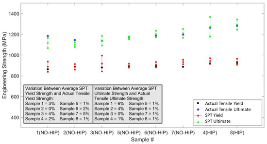 Build parameters and post-build processing parameters often vary between AM builds and even within a single build. This study was aimed at evaluating these variations in both HIP and non-HIP samples. In the present work, HIPed samples 4 and 8 showed higher average UTS and yield strengths compared to the non-HIPed samples. This result was seen in both the standard UTT measurements as well as the SPT measurements. Therefore, the results obtained in this work demonstrated the ability of SPT to produce reliable estimates of both yield strength and UTS, which are typically the most important properties used in optimizing the performance of the final product.