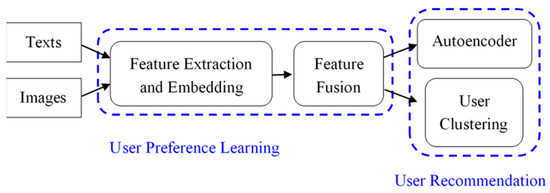 As shown in Figure 1, there are three modules in the proposed method: feature extraction and embedding, feature fusion, and user recommendation. First, user posts in social networks are collected as the dataset, where texts and images are extracted by using text and image convolutional networks, respectively. Second, text and image features are combined using feature fusion techniques as the representation of user preferences. Lastly, on the basis of the similarity among user preferences, top similar users are recommended by autoencoders and user clustering.