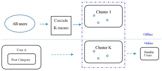 If the original user posts a new post, we only need to calculate the similarity for the members of the same group. If we have a new member, we just need to calculate which cluster it belongs to for recommendation and then calculate the similarity between cluster members, instead of all users. In addition, since clustering can be done offline, the method greatly improves the efficiency of online recommendation. The architecture is shown in Figure 6.
