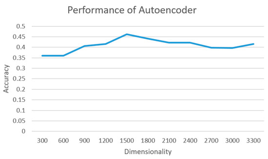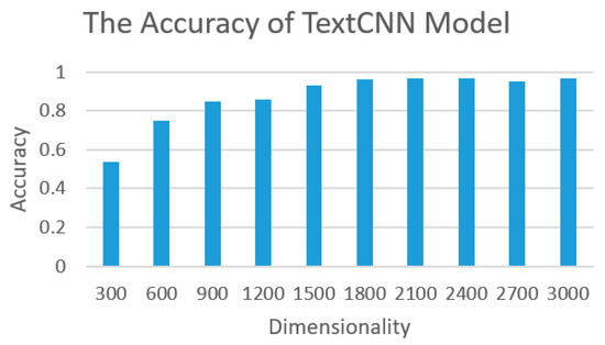 As shown in Figure 8, when the dimension was 2100, we could obtain the best performing TextCNN model with an accuracy of 96.8%. In the subsequent experiments, we used the dimension of 2100 for the TextCNN model. Then, when texts and images were input at the same time, we applied early fusion as shown in Figure 3. The best performance with an accuracy of 80% could be observed when the dimension was 4096. According to our observations, the lower accuracy might have been due to the number of classes in multiclass classification.