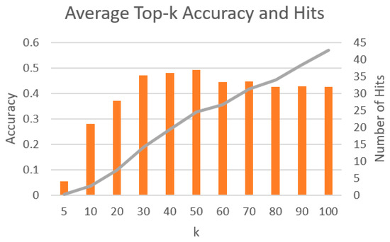 As shown in Figure 10, the average number of hits in our recommendation increased when k increased. Moreover, we could obtain the best average top-k accuracy of 0.491 when k = 50. This was also the best performance in all of our experiments. In the remaining experiments, we used the value of k as 50.